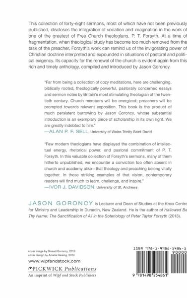 This collection of forty-eight sermons, most of which have not been previously published, discloses the integration of vocation and imagination in the work of one of the greatest of Free Church theologians, P. T. Forsyth. At a time of fragmentation, when theological study has become too much removed from the task of the preacher, Forsyth's work can remind us of the invigorating power of Christian doctrine interpreted and expounded in situations of pastoral and political exigency. Its capacity for the renewal of the church is evident again from this rich and timely anthology, compiled and introduced by Jason Goroncy.