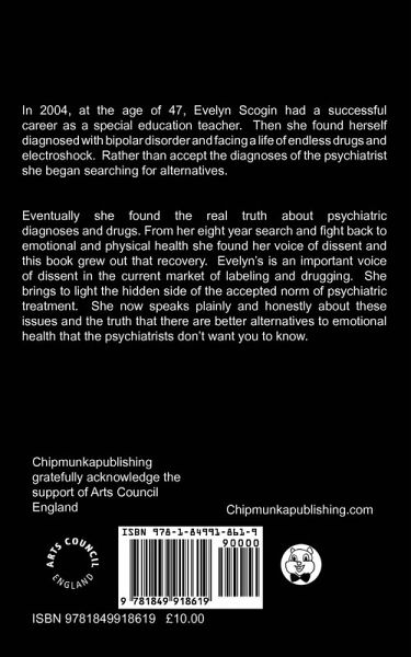 In 2004, at the age of 47, Evelyn Scogin had a successful career as a special education teacher. Then she found herself diagnosed with bipolar disorder and facing a life of endless drugs and electroshock. Rather than accept the diagnoses of the psychiatrist she began searching for alternatives. Eventually she found the real truth about psychiatric diagnoses and drugs. From her eight year search and fight back to emotional and physical health she found her voice of dissent and this book grew out that recovery. Evelyn's is an important voice of dissent in the current market of labeling and drugging. She brings to light the hidden side of the accepted norm of psychiatric treatment. She now speaks plainly and honestly about these issues and the truth that there are better alternatives to emotional health that the psychiatrists don't want you to know.