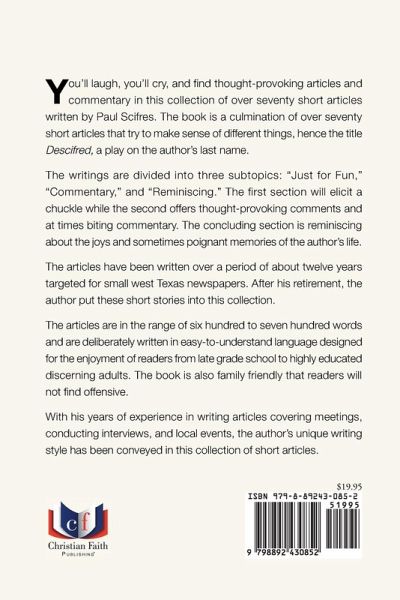 You'll laugh, you'll cry, and find thought-provoking articles and commentary in this collection of over seventy short articles written by Paul Scifres. The book is a culmination of over seventy short articles that try to make sense of different things, hence the title Descifred, a play on the author's last name. The writings are divided into three subtopics: "Just for Fun," "Commentary," and "Reminiscing." The first section will elicit a chuckle while the second offers thought-provoking comments and at times biting commentary. The concluding section is reminiscing about the joys and sometimes poignant memories of the author's life. The articles have been written over a period of about twelve years targeted for small west Texas newspapers. After his retirement, the author put these short stories into this collection. The articles are in the range of six hundred to seven hundred words and are deliberately written in easy-to-understand language designed for the enjoyment of readers from late grade school to highly educated discerning adults. The book is also family friendly that readers will not find offensive. With his years of experience in writing articles covering meetings, conducting interviews, and local events, the author's unique writing style has been conveyed in this collection of short articles.