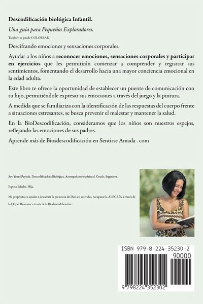 Descodificación biológica Infantil. Una guía para Pequeños Exploradores. Descifrando emociones y sensaciones corporales. Ayudar a los niños a reconocer emociones, sensaciones corporales y participar en ejercicios que les permitirán comenzar a comprender y registrar sus sentimientos, fomentando el desarrollo hacia una mayor conciencia emocional en la edad adulta. Este libro te ofrece la oportunidad de establecer un puente de comunicación con tu hijo, permitiéndole expresar sus emociones a través del juego y la pintura. A medida que se familiariza con la identificación de las respuestas del cuerpo frente a situaciones estresantes, se busca prevenir el malestar y mantener la salud. En la BioDescodificación, consideramos que los niños son nuestros espejos, reflejando las emociones de sus padres. Aprende más de Biosdescodificación en Sentirse Amada . com