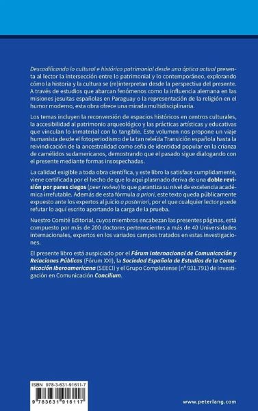 Descodificando lo cultural e histórico patrimonial desde una óptica actual presenta al lector la intersección entre lo patrimonial y lo contemporáneo, explorando cómo la historia y la cultura se reinterpretan desde la perspectiva del presente. A través de estudios que van desde la influencia alemana en las misiones jesuitas españolas en Paraguay hasta la representación de la religión en el humor moderno, esta obra ofrece una mirada multidisciplinaria. Los temas incluyen la reconversión de espacios históricos en centros culturales, la accesibilidad al patrimonio arqueológico y las prácticas artísticas y educativas que vinculan lo inmaterial con lo tangible. Este volumen supone un viaje por el patrimonio, desde el fotoperiodismo de la tan releída Transición española hasta la reivindicación de la ancestralidad como seña de identidad en la crianza de camélidos sudamericanos, demostrando que el pasado sigue dialogando con el presente en formas insospechadas.