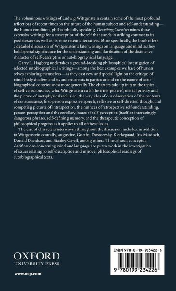 The voluminous writings of Ludwig Wittgenstein contain some of the most profound reflections of recent times on the nature of the human subject and self-understanding - the human condition, philosophically speaking. Describing Ourselves mines those extensive writings for a conception of the self that stands in striking contrast to its predecessors as well as its more recent alternatives. More specifically, the book offers a detailed discussion of Wittgenstein's later writings on language and mind as they hold special significance for the understanding and clarification of the distinctive character of self-descriptive or autobiographical language. Garry L. Hagberg undertakes a ground-breaking philosophical investigation of selected autobiographical writings--among the best examples we have of human selves exploring themselves--as they cast new and special light on the critique of mind-body dualism and its undercurrents in particular and on the nature of autobiographical consciousness more generally. The chapters take up in turn the topics of self-consciousness, what Wittgenstein calls 'the inner picture', mental privacy and the picture of metaphysical seclusion, the very idea of our observation of the contents of consciousness, first-person expressive speech, reflexive or self-directed thought and competing pictures of introspection, the nuances of retrospective self-understanding, person-perception and the corollary issues of self-perception (itself an interestingly dangerous phrase), self-defining memory, and the therapeutic conception of philosophical progress as it applies to all of these issues. The cast of characters interwoven throughout this rich discussion include, in addition to Wittgenstein centrally, Augustine, Goethe, Dostoevsky, Kierkegaard, Iris Murdoch, Donald Davidson, and Stanley Cavell, among others. Throughout, conceptual clarifications concerning mind and language are put to work in the investigation of issues relating to self-description and in novel philosophical readings of autobiographical texts.