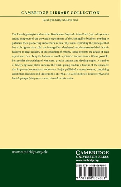 The French geologist and traveller Barthélemy Faujas de Saint-Fond (1741-1819) was a strong supporter of the aerostatic experiments of the Montgolfier brothers, seeking to publicise their pioneering endeavours in this 1783 work. Exploiting the principle that hot air is lighter than cold, the Montgolfiers developed and demonstrated their hot air balloons to great acclaim. In this collection of reports, Faujas presents the details of each experiment, describing the balloons as well as potential improvements. Where possible, he specifies the position of witnesses, precise timings and viewing angles. A number of finely engraved plates enhance the work, giving readers a flavour of the spectacle that impressed contemporary observers. Faujas published a second volume, containing additional accounts and illustrations, in 1784. His Minéralogie des volcans (1784) and Essai de géologie (1803-9) are also reissued in this series.