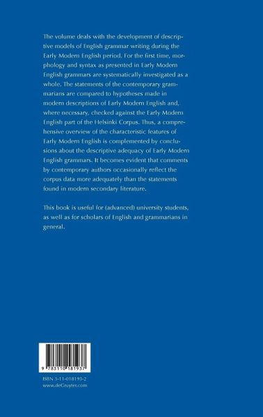 The book deals with the development of descriptive models of English grammar writing during the Early Modern English period. For the first time, morphology and syntax as presented in Early Modern English grammars are systematically investigated as a whole. The statements of the contemporary grammarians are compared to hypotheses made in modern descriptions of Early Modern English and, where necessary, checked against the Early Modern English part of the Helsinki Corpus. Thus, a comprehensive overview of the characteristic features of Early Modern English is complemented by conclusions about the descriptive adequacy of Early Modern English grammars. It becomes evident that comments by contemporary authors occasionally reflect the corpus data more adequately than the statements found in modern secondary literature.
