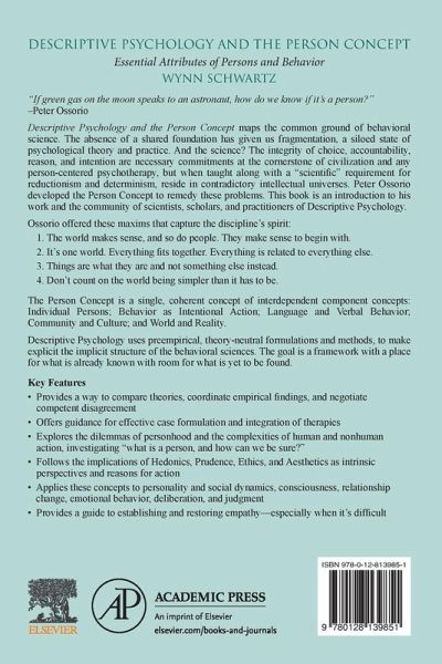 "A colleague of mine, when the subject of Descriptive Psychology ("DP") came up at a recent conference, informed me that a fellow attendee quipped that it was "psychology's best kept secret". Created by Peter Ossorio, and applied by him to topics as far ranging as artificial intelligence software for NASA, the nature of emotion, and the practice of psychotherapy, DP has somehow managed to escape the significant notice within psychology that this most innovative and ingenious approach deserves. Hopefully, Dr. Schwartz's book will serve to change this situation. Written by one of DP's foremost exponents, Descriptive Psychology and the Person Concept sets forth the key concepts of DP in an accessible and reader-friendly fashion. Along the way, Dr. Schwartz clarifies these concepts by providing numerous interesting applications (e.g., to topics of empathy, emotional competence, and theory of mind) that illustrate DP's many uses in an engaging way. I highly recommend this book to any person interested in exploring new, powerful, and different ideas in the fields of psychological science, psychopathology, and/or psychotherapy." --Raymond M. Bergner, Ph.D., Professor of Clinical Psychology, Department of Psychology, Illinois State University, author of: Pathological self-criticism: Assessment and treatment. (Springer Publishing)