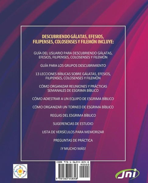 Descubriendo Gálatas, Efesios, Filipenses, Colosenses y Filemón incluye: Guía del usuario para Descubriendo Gálatas, Efesios, Filipenses, Colosenses y Filemón Guía para los grupos descubrimiento 13 lecciones bíblicas sobre Gálatas, Efesios, Filipenses, Colosenses y Filemón Cómo organizar reuniones y practices semanales de Esgrima Bíblico Cómo adiestrar a un equipo de Esgrima Bíblico Cómo organizar un torneo de Esgrima Bíblico Reglas del Esgrima Bíblico Sugerencias de estudio Lista de versículos para memorizar Preguntas de práctica ¡Y mucho más!