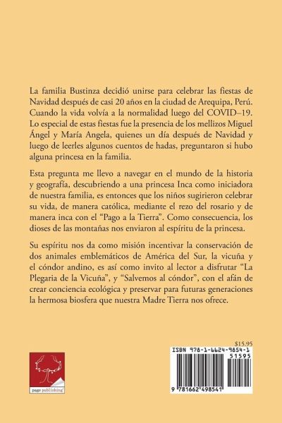La familia Bustinza decidió unirse para celebrar las fiestas de Navidad después de casi 20 años en la ciudad de Arequipa, Perú. Cuando la vida volvía a la normalidad luego del COVID-19. Lo especial de estas fiestas fue la presencia de los mellizos Miguel Ángel y María Angela, quienes un día después de Navidad y luego de leerles algunos cuentos de hadas, preguntaron si hubo alguna princesa en la familia. Esta pregunta me llevo a navegar en el mundo de la historia y geografía, descubriendo a una princesa Inca como iniciadora de nuestra familia, es entonces que los niños sugirieron celebrar su vida, de manera católica, mediante el rezo del rosario y de manera inca con el "Pago a la Tierra". Como consecuencia, los dioses de las montañas nos enviaron al espíritu de la princesa. Su espíritu nos da como misión incentivar la conservación de dos animales emblemáticos de América del Sur, la vicuña y el cóndor andino, es así como invito al lector a disfrutar "La Plegaria de la Vicuña", y "Salvemos al cóndor", con el afán de crear conciencia ecológica y preservar para futuras generaciones la hermosa biosfera que nuestra Madre Tierra nos ofrece.
