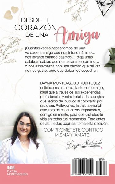 ¡Cuántas veces necesitamos de una verdadera amiga que nos infunda ánimo... nos levante cuando caemos... diga unas palabras sabias que nos aclaren el camino... o nos estremezca con una verdad que tal vez no nos guste, pero que debemos escuchar!Dayna Monteagudo Rodríguez entiende este anhelo, tanto como mujer, igual que a través de sus experiencias profesionales y ministeriales. La acogida que recibió del público al compartir por radio sus Reflexiones, la trajo a escribir este libro de enseñanzas inspiradoras, contigo en mente, para que disfrutes tu vida en todos tus momentos. Pero antes de abrir estas páginas, toma esta decisión: ¡Comprométete contigo misma y ámate!