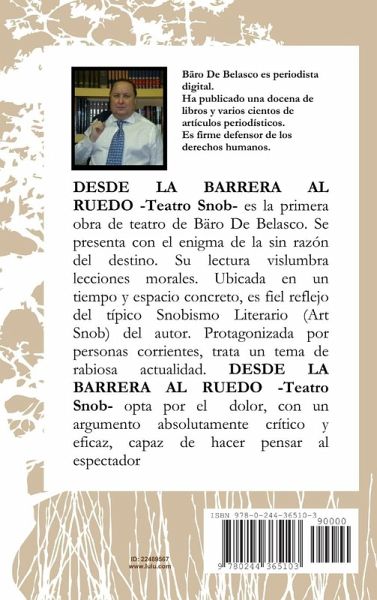 DESDE LA BARRERA AL RUEDO es la primera obra de teatro de Bäro De Belasco. Se presenta con el enigma de la sin razón del destino. Su lectura vislumbra lecciones morales. Ubicada en un tiempo y espacio concreto, es fiel reflejo del típico Snobismo Literario (Art Snob) del autor. Protagonizada por personas corrientes, trata un tema de rabiosa actualidad. DESDE LA BARRERA AL RUEDO opta por el dolor, con un argumento absolutamente crítico y eficaz, capaz de hacer pensar al espectador