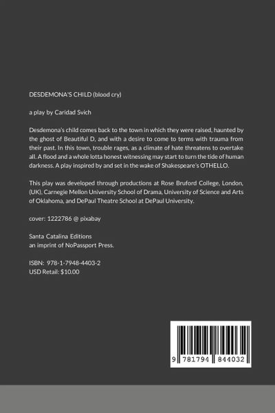 DESDEMONA'S CHILD (blood cry) a play by Caridad Svich. Desdemona's child comes back to the town in which they were raised, haunted by the ghost of Beautiful D, and with a desire to come to terms with trauma from their past. In this town, trouble rages, as a climate of hate threatens to overtake all. A flood and a whole lotta honest witnessing may start to turn the tide of human darkness. A play inspired by and set in the wake of Shakespeare's OTHELLO. This play was developed through productions at Rose Bruford College, London, (UK), Carnegie Mellon University School of Drama, University of Science and Arts of Oklahoma, and DePaul Theatre School at DePaul University. This is a Santa Catalina Editions/NoPassport Press editon of the play.