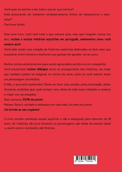 Você quer se excitar e dar todo o prazer que merece?Está procurando um momento verdadeiramente íntimo de relaxamento e bem-estar?Então continue lendo!Com este livro, você terá tudo o que sempre quis e que ninguém nunca lhe deu: muitas e muitas histórias explícitas em português, exatamente como você sempre quis!Você tem diante de si uma coleção de histórias explícitas dedicadas ao bom sexo que é possível entre homens e mulheres que gostam de agradar um ao outro. Muitos contos excitantes para experimentar sozinho ou acompanhado.Você encontrará muitos diálogos entre os protagonistas das histórias, de modo que também poderá se imaginar no centro da cena, como se você mesmo fosse um personagem da história.Então, o que está esperando? Deixe-se levar pela paixão, pela provocação, pelas fantasias proibidas que você sempre teve, deixe de lado suas inibições e comece a viajar com as emoções.Sem censura, 100% de prazer.Relaxe, fique à vontade e embarque em uma bela jornada de prazer.Um brinde ao seu orgasmo!