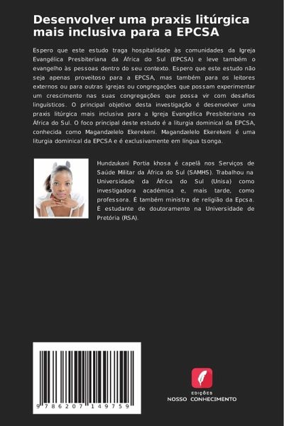 Espero que este estudo traga hospitalidade às comunidades da Igreja Evangélica Presbiteriana da África do Sul (EPCSA) e leve também o evangelho às pessoas dentro do seu contexto. Espero que este estudo não seja apenas proveitoso para a EPCSA, mas também para os leitores externos ou para outras igrejas ou congregações que possam experimentar um crescimento nas suas congregações que possa vir com desafios linguísticos. O principal objetivo desta investigação é desenvolver uma praxis litúrgica mais inclusiva para a Igreja Evangélica Presbiteriana na África do Sul. O foco principal deste estudo é a liturgia dominical da EPCSA, conhecida como Magandzelelo Ekerekeni. Magandzelelo Ekerekeni é uma liturgia dominical da EPCSA e é exclusivamente em língua tsonga.