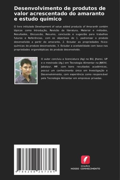 O livro intitulado Development of value added products of Amaranth contém tópicos como Introdução, Revisão da literatura, Material e métodos, Resultados, Discussão, Resumo, conclusão e sugestão para trabalhos futuros e Referências, com os objectivos de 1. padronizar o produto desenvolvido a partir do amaranto, 2. Estudar as propriedades físico-químicas do produto desenvolvido, 3. Estudar a aceitabilidade com base nas propriedades organolépticas do produto desenvolvido.