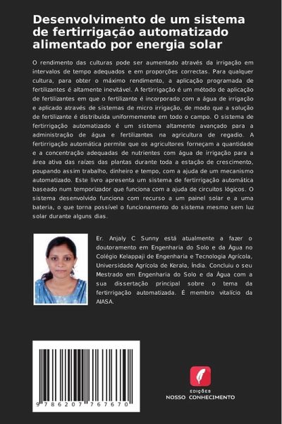 O rendimento das culturas pode ser aumentado através da irrigação em intervalos de tempo adequados e em proporções correctas. Para qualquer cultura, para obter o máximo rendimento, a aplicação programada de fertilizantes é altamente inevitável. A fertirrigação é um método de aplicação de fertilizantes em que o fertilizante é incorporado com a água de irrigação e aplicado através de sistemas de micro irrigação, de modo que a solução de fertilizante é distribuída uniformemente em todo o campo. O sistema de fertirrigação automatizado é um sistema altamente avançado para a administração de água e fertilizantes na agricultura de regadio. A fertirrigação automática permite que os agricultores forneçam a quantidade e a concentração adequadas de nutrientes com água de irrigação para a área ativa das raízes das plantas durante toda a estação de crescimento, poupando assim trabalho, dinheiro e tempo, com a ajuda de um mecanismo automatizado. Este livro apresenta um sistema de fertirrigação automática baseado num temporizador que funciona com a ajuda de circuitos lógicos. O sistema desenvolvido funciona com recurso a um painel solar e a uma bateria, o que torna possível o funcionamento do sistema mesmo sem luz solar durante alguns dias.
