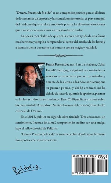 "Deseos, Poemas de la vida" es un compendio poético para el disfrute de los amantes de la poesía y las conexiones amorosas, es parte integral de la vida en el que se relata a modo de poema, las diferentes situaciones que a muchos nos toca vivir en nuestro diario andar. La poesía toca el alma de quienes la leen y nos ayuda de una forma más hermosa y simple a comprender el sentir del artífice de las letras y a darnos cuenta que tanto nos conecta con su magia y realidad.