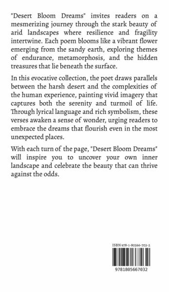 "Desert Bloom Dreams" invites readers on a mesmerizing journey through the stark beauty of arid landscapes where resilience and fragility intertwine. Each poem blooms like a vibrant flower emerging from the sandy earth, exploring themes of endurance, metamorphosis, and the hidden treasures that lie beneath the surface. In this evocative collection, the poet draws parallels between the harsh desert and the complexities of the human experience, painting vivid imagery that captures both the serenity and turmoil of life. Through lyrical language and rich symbolism, these verses awaken a sense of wonder, urging readers to embrace the dreams that flourish even in the most unexpected places. With each turn of the page, "Desert Bloom Dreams" will inspire you to uncover your own inner landscape and celebrate the beauty that can thrive against the odds.