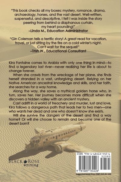 "This book checks all my boxes: mystery, romance, drama, archaeology, horses, and the vast desert. Well-written, suspenseful, and descriptive, I felt I was inside the story peering from behind a diaphanous curtain, my heart pounding!" -Linda M., Education Administrator Kira Fontaine comes to Arabia with only one thing in mind-to find a legendary lost river-never realizing her life is about to change forever. When she crawls from the wreckage of her plane, she finds herself stranded in a vast, unforgiving desert. Relying on her Native American ancestral knowledge and skills, and her faith, she searches for a way home. Along the way, she saves a mythical golden horse who, in turn, saves her. Her journey becomes more difficult when she discovers a hidden valley with an ancient mystery. Cast adrift in a world of treachery and murder, lust and love, Kira follows a dangerous path that leads her to two men-one who wants her dead and one who doesn't know she exists. Will she survive the dangers of the desert and find a way home? Or will she choose to remain and become one of the desert born?