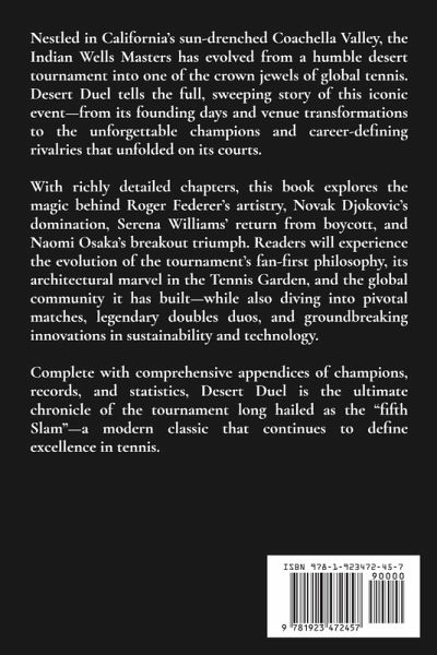 Nestled in California's sun-drenched Coachella Valley, the Indian Wells Masters has evolved from a humble desert tournament into one of the crown jewels of global tennis. Desert Duel tells the full, sweeping story of this iconic event-from its founding days and venue transformations to the unforgettable champions and career-defining rivalries that unfolded on its courts. With richly detailed chapters, this book explores the magic behind Roger Federer's artistry, Novak Djokovic's domination, Serena Williams' return from boycott, and Naomi Osaka's breakout triumph. Readers will experience the evolution of the tournament's fan-first philosophy, its architectural marvel in the Tennis Garden, and the global community it has built-while also diving into pivotal matches, legendary doubles duos, and groundbreaking innovations in sustainability and technology. Complete with comprehensive appendices of champions, records, and statistics, Desert Duel is the ultimate chronicle of the tournament long hailed as the "fifth Slam"-a modern classic that continues to define excellence in tennis.
