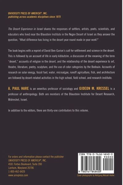 This book shares the responses of settlers, artists, poets, scientists, and educators who lived near the Blaustein Institute in the Negev Desert of Israel as they answer the question, 'What difference has living in the desert year round made in your work?'