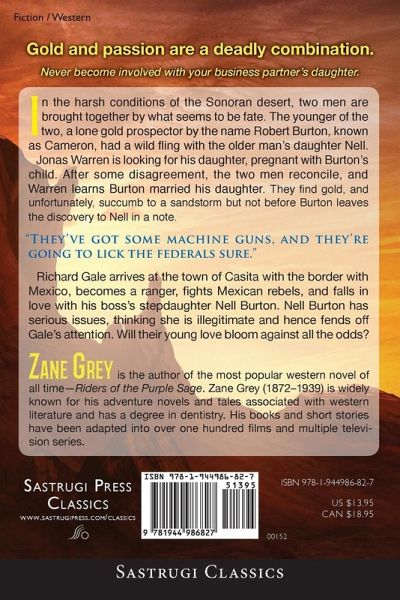 Gold and passion are a deadly combination. Never become involved with your business partner's daughter. The definitive edition. • Features an extended biography of the life and experiences of Pearl Zane Grey In the harsh conditions of the Sonoran desert, two men are brought together by what seems to be fate. The younger of the two, a lone gold prospector by the name Robert Burton alias Cameron, had a wild fling with the older man's daughter Nell. Jonas Warren is looking for his daughter, pregnant with Burton's child. After some disagreement, the two men reconcile, and Warren learns Burton married his daughter. They find gold, and unfortunately, succumb to a sandstorm but not before Burton leaves the discovery to Nell in a note. "They’ve got some machine guns, and they’re going to lick the federals sure." Richard Gale arrives at the town of Casita with the border with Mexico, becomes a ranger, fights Mexican rebels, and falls in love with his boss's stepdaughter Nell Burton. Nell Burton has serious issues, thinking she is illegitimate and hence fends off Gale's attention. Will their young love bloom against all the odds? Get a copy of the Sastrugi Press edition and find out today!