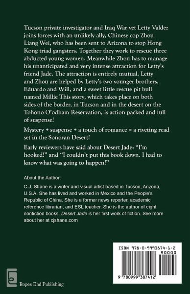 Tucson private investigator and Iraq War veteran Letty Valdez joins forces with an unlikely ally, Chinese police Detective Inspector Zhou Liang Wei, in Desert Jade, a fast-paced mystery-suspense thriller set in the Sonoran Desert. Letty represents the three cultures of the Borderlands: Mexican American, Native American (Tohono O’odham), and Anglo American. As an Iraq War veteran, Letty struggles every day with the trauma of the war and loss. Yet she persists valiantly in her work as a private investigator and in her role as the youthful de facto matriarch of her family. Her devotion to her parentless younger siblings cannot be overestimated. Zhou (his name sounds like "Joe") has been sent to Arizona on the advice of Interpol to track the activities of Hong Kong triad gangsters. He has an additional task – to find Victoria Wong, the abducted daughter of a Hong Kong official. Zhou knows the lethal character of the gangsters and how they will go to any length to achieve their goals, including chopping off limbs of anyone who gets in their way. Zhou has to find the abducted girl quickly before she is murdered or sold into sex slavery. What Zhou does not anticipate is the intense attraction he feels for Letty’s friend Jade whom he meets shortly after arriving in Tucson. The attraction is mutual. Unfortunately, Jade is unaccountably in the triad gangsters’ crosshairs, and she finds herself directly threatened by their violence. Letty has another problem. She’s been hired to clear the name of her new client’s nephew who has been accused of murdering a local woman. Letty quickly learns of a connection between the murder and the Chinese gangsters Zhou is seeking. We met Eduardo, Letty’s little brother, who rescues a migrant girl named Esperanza whom he finds dying in the desert on the Tohono O’odham reservation. Esperanza, too, is destined to fall into the hands of the Hong Kong gangsters. And Will has a say in this story, too. Will is Letty’s 17-year-old baby brother who is interested in three things: long-distance bicycling, a fellow bicycling enthusiast named Clarice, and his dog Millie –until the night that Will gets in the way of one of the Triad killers. Then there’s Milagro (aka Millie), the runt-sized female pit bull who was made into bait for a dog-fighting ring, then dumped in the hot desert sand to die when her wounds were too severe to go on. Letty finds and rescues Millie. The cheerful little rescue dog then devotes herself to two goals: to be allowed to sit on the couch with the humans; and to look out for Letty and Will’s safety and well-being – which includes dealing personally with a gangster bent on killing Will. Dog lovers especially will enjoy Millie’s contribution to this story. An early reviewer said about Desert Jade, "I couldn’t put this book down. I had to know what happens next!" Mystery + suspense +a touch of romance = a riveting mystery-suspense story set in the Sonoran Desert!
