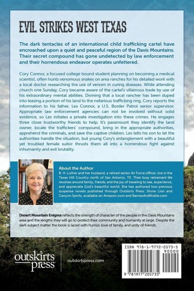The dark tentacles of a child trafficking cartel have encroached upon a quiet and peaceful region of the Davis Mountains. Their secret compound has gone undetected by law enforcement and their horrendous endeavor operates unfettered. Cory Connor, a focused college bound student planning on becoming a medical scientist, often hunts venomous snakes and insects on area ranches for his detailed work with a local doctor researching how venom may be used to cure diseases. While attending church one Sunday, Cory became aware of the cartel's villainous trade by use of his extraordinary mental and observational abilities. Divining that a local rancher has been duped into leasing a portion of his land to the nefarious trafficking ring, Cory reports the information to his father Les Connor, a U.S. border patrol senior supervisor. Appropriate law enforcement agencies cannot be involved without solid evidence, so Les initiates a private investigation into these crimes. He engages three close friends he trusted to help. It's paramount they identify the land owner, locate the traffickers' compound, bring in the appropriate authorities, apprehend the criminals, and save the children. Les tells his son to let the authorities handle the situation, but young Cory's entanglement with a beautiful yet troubled female suitor thrust them all into an unforgiving plight of brutality. Desert Mountain Enigma reflects the strength of character of the people in the Davis Mountains area and what lengths they will go to protect their community and humanity at large. Despite the dark subject matter the book is laced with humor, love of family, and unity of friends.
