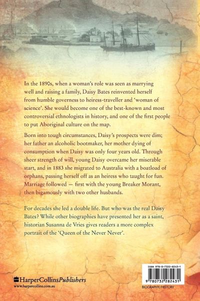 In the 1890s, when a woman's role was seen as marrying well and raising a family, Daisy Bates reinvented herself from humble governess to heiress-traveller and 'woman of science'. She would become one of the best-known and most controversial ethnologists in history, and one of the fi rst people to put Aboriginal culture on the map. Born into tough circumstances, Daisy's prospects were dim; her father an alcoholic bootmaker, her mother dying of consumption when Daisy was only four years old. through sheer strength of will, young Daisy overcame her miserable start, and in 1883 she migrated to Australia with a boatload of orphans, passing herself off as an heiress who taught for fun. Marriage followed - first with the young Breaker Morant, then bigamously with two other husbands. For decades she led a double life. But who was the real Daisy Bates? While other biographies have presented her as a saint, historian Susanna de Vries gives readers a more complex portrait of the 'Queen of the Never Never'.