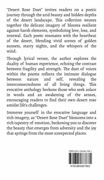 "Desert Rose Duet" invites readers on a poetic journey through the arid beauty and hidden depths of the desert landscape. This collection weaves together the delicate imagery of blooms resilient against harsh elements, symbolizing love, loss, and renewal. Each poem resonates with the heartbeat of the desert, blending vivid scenes of golden sunsets, starry nights, and the whispers of the wind. Through lyrical verses, the author explores the duality of human experience, echoing the contrast between fragility and strength. The duet of voices within the poems reflects the intimate dialogue between nature and self, revealing the interconnectedness of all living things. This evocative anthology beckons those who seek solace in words and an awakening of the senses, encouraging readers to find their own desert rose amidst life's challenges. Immerse yourself in the evocative language and rich imagery, as "Desert Rose Duet" blossoms into a rich tapestry of emotion, beckoning you to discover the beauty that emerges from adversity and the joy that springs from the most unexpected places.