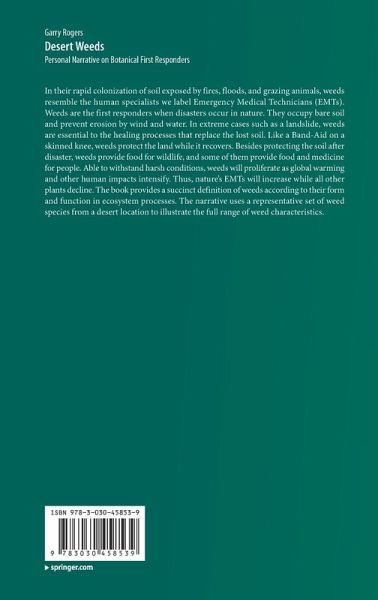 In their rapid colonization of soil exposed by fires, floods, and grazing animals, weeds resemble the human specialists we label Emergency Medical Technicians (EMTs). Weeds are the first responders when disasters occur in nature. They occupy bare soil and prevent erosion by wind and water. In extreme cases such as a landslide, weeds are essential to the healing processes that replace the lost soil. Like a Band-Aid on a skinned knee, weeds protect the land while it recovers. Besides protecting the soil after disaster, weeds provide food for wildlife, and some of them provide food and medicine for people. Able to withstand harsh conditions, weeds will proliferate as global warming and other human impacts intensify. Thus, nature's EMTs will increase while all other plants decline. The book provides a succinct definition of weeds according to their form and function in ecosystem processes. The narrative uses a representative set of weed species from a desert location to illustrate the full range of weed characteristics.
