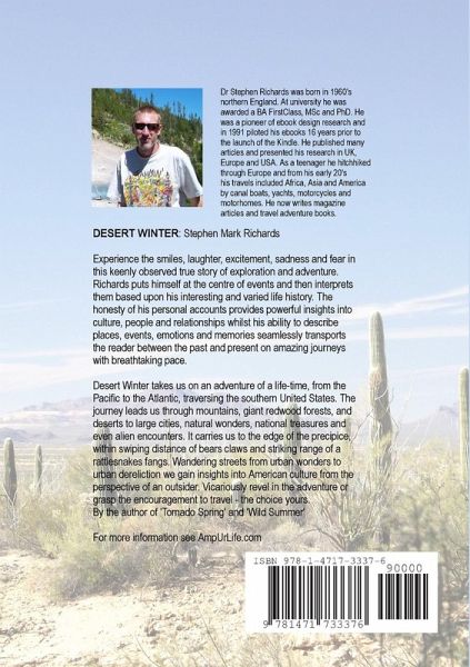 Experience the smiles, laughter, excitement, sadness and fear in this keenly observed true story of exploration and adventure. Richards puts himself at the centre of events and then interprets them based upon his interesting and varied life history. The honesty of his personal accounts provides powerful insights into culture, people and relationships whilst his ability to describe places, events, emotions and memories seamlessly transports the reader between the past and present on amazing journeys with breathtaking pace. It is an adventure of a life-time, from Pacific to Atlantic traversing the southern USA, leading through mountains, giant redwoods, and deserts to cities, natural wonders, national treasures and even alien encounters. It carries us to the edge of the precipice, within swiping distance of bears and striking range of rattlesnakes. Wandering streets from wealth to dereliction we gain insights into American culture. Revel in the adventure or grasp the encouragement to travel - the choice yours.