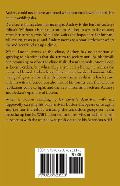 Audrey could never have suspected what heartbreak would befall her on her wedding day. Deserted minutes after her marriage, Audrey is the butt of society's ridicule. Without a home to return to, Audrey moves to the country estate her parents own. While she waits and hopes that her husband will return, years pass, and Audrey moves to a poor settlement where she and her friend set up a clinic. When Lucien arrives at the clinic, Audrey has no intention of agreeing to his wishes that she return to society until he blackmails her, promising to close the clinic if she doesn't comply. Audrey does as Lucien orders, but when they arrive at his home, he realises the scorn and hatred Audrey has suffered due to his abandonment. After taking refuge in his best friend's house, Lucien realises he has lost not only his wife's affection but also that of his former best friend. Some revelations come to light, and the new information softens Audrey's and Beckett's opinions of Lucien. When a woman claiming to be Lucien's American wife and claiming to be carrying his baby arrives, Lucien disappears once again, and the ton is gleefully watching the scandalous goings-on in the Beauchamp family. Will Lucien return to his wife, or will he remain in America with the woman who professes to be his American wife?