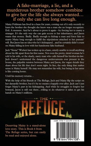 A fake-marriage, a lie, and a murderous brother somehow combine to give her the life she always wanted...if only she can live long enough. Maisy Feldman has lived in a haze for years, coming out of it only recently to learn the brother she thought she knew was a man she no longer recognizes. Evil. A monster. And he's about to prove it again-by forcing her to marry a stranger. It's the only way she can gain access to her inheritance, and Jason wants that money. Badly. Badly enough to kidnap a man and force him to marry Maisy long enough to fulfill the stipulations attached to her parents' will. But Jason has no idea who he's kidnapped...and he certainly didn't count on Maisy falling in love with her handsome fake husband. Jack "Stone" Wickett has woken up in a haze, utterly unable to recall anything about his life apart from his first name. Not even the pretty, timid woman he's told is his wife, or the shady, nasty man who calls himself his brother-in-law. Jack doesn't understand the dangerous undercurrents ever present in the house, the palpable tension between Maisy and Jason, the vague details they share about his life that don't seem right. In fact, the only thing that makes sense is Maisy herself. He may not remember his wife, but being in her arms is like coming home. Until his memory returns... With the help of his friends at The Refuge, Jack and Maisy flip the script on her dastardly brother, but it's by no means a happily ever after. Jack can't just forget Maisy's part in his kidnapping. And while he struggles to forgive her betrayal, Jason is still out there...willing to do whatever it takes to get his hands on Maisy's millions. **Deserving Maisy is the 6th book in The Refuge Series. Each book is a stand-alone, with no cliffhanger endings.