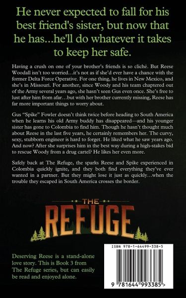 He never expected to fall for his best friend's sister, but now that he has...he'll do whatever it takes to keep her safe. Having a crush on one of your brother's friends is so cliché. But Reese Woodall isn't too worried...it's not as if she'd ever have a chance with the former Delta Force Operative. For one thing, he lives in New Mexico, and she's in Missouri. For another, since Woody and his team chaptered out of the Army several years ago, she hasn't seen Gus even once. She's free to lust after him from afar...but with her brother currently missing, Reese has far more important things to worry about. Gus "Spike" Fowler doesn't think twice before heading to South America when he learns his old Army buddy has disappeared-and his younger sister has gone to Colombia to find him. Though he hasn't thought much about Reese in the last five years, he certainly remembers her. The curvy, sexy, stubborn engineer is hard to forget. He liked what he saw years ago. And now? After she surprises him in the best way during a high-stakes bid to rescue Woody from a drug cartel? He likes her even more. Safely back at The Refuge, the sparks Reese and Spike experienced in Colombia quickly ignite, and they both find everything they've ever wanted in a partner. But they might lose it just as quickly...when the trouble they escaped in South America crosses the border. **Deserving Reese is the 3rd book in The Refuge Series. Each book is a stand-alone, with no cliffhanger endings.
