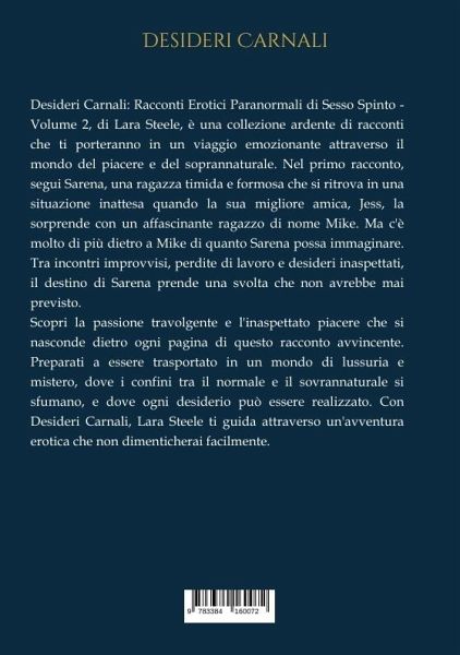 Desideri Carnali: Racconti Erotici Paranormali di Sesso Spinto - Volume 2, di Lara Steele, è una collezione ardente di racconti che ti porteranno in un viaggio emozionante attraverso il mondo del piacere e del soprannaturale. Nel primo racconto, segui Sarena, una ragazza timida e formosa che si ritrova in una situazione inattesa quando la sua migliore amica, Jess, la sorprende con un affascinante ragazzo di nome Mike. Ma c'è molto di più dietro a Mike di quanto Sarena possa immaginare. Tra incontri improvvisi, perdite di lavoro e desideri inaspettati, il destino di Sarena prende una svolta che non avrebbe mai previsto.Scopri la passione travolgente e l'inaspettato piacere che si nasconde dietro ogni pagina di questo racconto avvincente. Preparati a essere trasportato in un mondo di lussuria e mistero, dove i confini tra il normale e il sovrannaturale si sfumano, e dove ogni desiderio può essere realizzato. Con Desideri Carnali, Lara Steele ti guida attraverso un'avventura eroticache non dimenticherai facilmente.