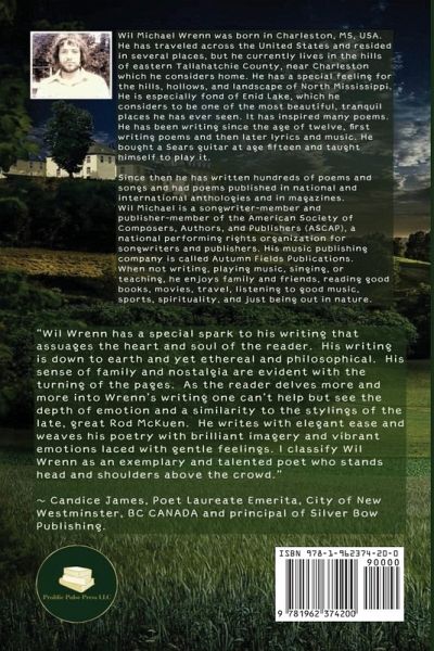 Wil Michael Wrenn was born in Charleston, MS, USA. He has traveled across the United States and resided in several places, but he currently lives in the hills of eastern Tallahatchie County near Charleston which he considers home. He has a special feeling for the hills, hollows, and landscape of North Mississippi. He is especially fond of Enid Lake, which he considers to be one of the most beautiful, tranquil places he has ever seen. It has inspired many poems.He has been writing since the age of twelve, first writing poems and then later lyrics and music. He bought a Sears guitar at age fifteen and taught himself how to play.Since then, he has written hundreds of poems and songs and had poems published in national and international anthologies and in magazines. He has also published four books of original poetry: Songs of Solitude; Seasons of a Sojourner; and Enid Lake Mosaic; the latter two books were published by Silver Bow Publishing, of British Columbia, Canada. His most recent book, Fog, was published in 2023.Wil Michael is a songwriter-member and publisher-member of the American Society of Composers, Authors, and Publishers (ASCAP), a national performing rights organization for songwriters and publishers. His music publishing company is called Autumn Fields Publications. When not writing, playing music, singing, or teaching, he enjoys family and friends, reading good books, movies, travel, listening to good music, sports, spirituality, and just being out in nature.¿