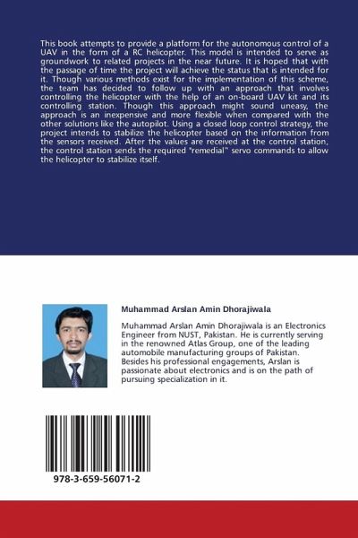 This book attempts to provide a platform for the autonomous control of a UAV in the form of a RC helicopter. This model is intended to serve as groundwork to related projects in the near future. It is hoped that with the passage of time the project will achieve the status that is intended for it. Though various methods exist for the implementation of this scheme, the team has decided to follow up with an approach that involves controlling the helicopter with the help of an on-board UAV kit and its controlling station. Though this approach might sound uneasy, the approach is an inexpensive and more flexible when compared with the other solutions like the autopilot. Using a closed loop control strategy, the project intends to stabilize the helicopter based on the information from the sensors received. After the values are received at the control station, the control station sends the required "remedial servo commands to allow the helicopter to stabilize itself.