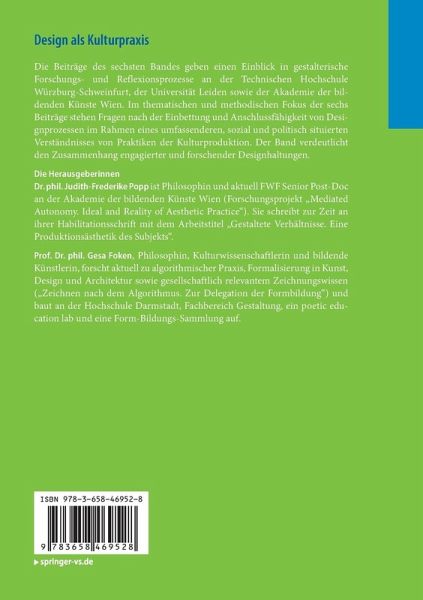 Dr. phil. Judith-Frederike Popp ist Philosophin und aktuell FWF Senior Post-Doc an der Akademie der bildenden Künste Wien (Forschungsprojekt "Mediated Autonomy. Ideal and Reality of Aesthetic Practice"). Sie schreibt zur Zeit an ihrer Habilitationsschrift mit dem Arbeitstitel "Gestaltete Verhältnisse. Eine Produktionsästhetik des Subjekts". Prof. Dr. phil. Gesa Foken, Philosophin, Kulturwissenschaftlerin und bildende Künstlerin, forscht aktuell zu algorithmischer Praxis, Formalisierung in Kunst, Design und Architektur sowie gesellschaftlich relevantem Zeichnungswissen ("Zeichnen nach dem Algorithmus. Zur Delegation der Formbildung") und baut an der Hochschule Darmstadt, Fachbereich Gestaltung, ein poetic education lab und eine Form-Bildungs-Sammlung auf.