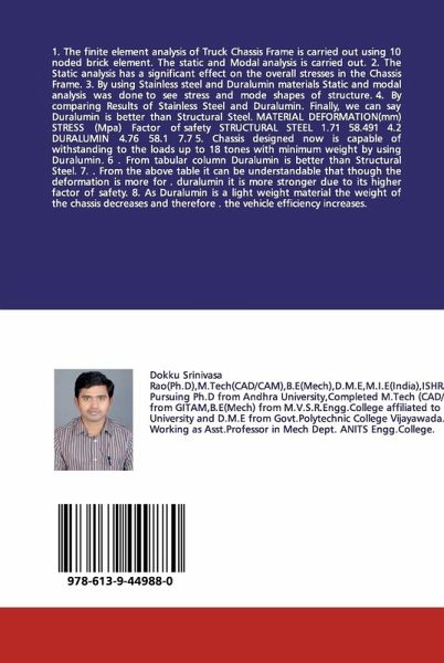 1. The finite element analysis of Truck Chassis Frame is carried out using 10 noded brick element. The static and Modal analysis is carried out. 2. The Static analysis has a significant effect on the overall stresses in the Chassis Frame. 3. By using Stainless steel and Duralumin materials Static and modal analysis was done to see stress and mode shapes of structure. 4. By comparing Results of Stainless Steel and Duralumin. Finally, we can say Duralumin is better than Structural Steel. MATERIAL DEFORMATION(mm) STRESS (Mpa) Factor of safety STRUCTURAL STEEL 1.71 58.491 4.2 DURALUMIN 4.76 58.1 7.7 5. Chassis designed now is capable of withstanding to the loads up to 18 tones with minimum weight by using Duralumin. 6 . From tabular column Duralumin is better than Structural Steel. 7. . From the above table it can be understandable that though the deformation is more for . duralumin it is more stronger due to its higher factor of safety. 8. As Duralumin is a light weight material theweight of the chassis decreases and therefore . the vehicle efficiency increases.
