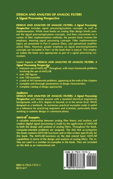 Useful Aspects of Design and Analysis of Analog Filters: A Signal Processing Perspective extensive use of MATLAB® throughout, with many homework problems involving the use of MATLAB. over 200 figures; over 100 examples; a total of 345 homework problems, appearing at the ends of the chapters; complete and thorough presentation of design characteristics; complete catalog of design approaches. Audience: Design and Analysis of Analog Filters: A Signal Processing Perspective will interest anyone with a standard electrical engineering background, with a B.S. degree or beyond, or at the senior level. While designed as a textbook, its numerous practical examples make it useful as a reference for practicing engineers and scientists, particularly those working in systems design or communications.