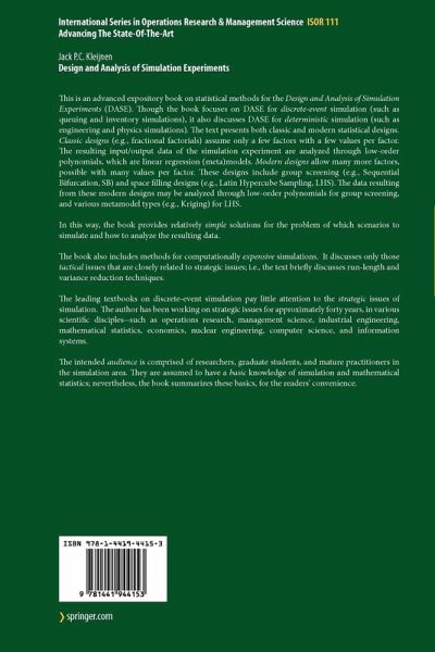 "This work represents a lucid, comprehensive, authoritative, and highly informative presentation of the techniques and methodology associated with simulation experimentation. The book is 'lucid' because, as the word implies, it sheds light on the subject matter of simulation experimentation and optimization; it is 'comprehensive' because it addresses all of the essential topics in the field; it is 'authoritative'' because it captures the essence of the best research in the field, as evidenced by its more than 400 authoritative citations; and it is ''informative' in that it distills the most important scholarship of the last six decades into a 210-page study of the DASE field. Jack Kleijnen has once again produced a cutting-edge approach to the design and analysis of simulation experiments. His 1974-75 books were an incisive compilation of statistical methodology in simulation and introduced the term metamodeling to the lexicon of simulation experimentation. His 2008 volume Design and Analysis of Simulation Experiments promises to popularize the term DASE in the same way. Many of us who specialize in the field of simulation experimentation and optimization have avidly followed Kleijnen's writings for almost four decades. This latest work leads the way in this endeavor, and is a vital addition to the important scholarship in the field." (William E. BILES, JASA, June 2009, Vol. 104, No. 486)