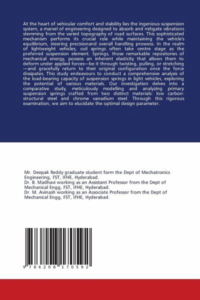 At the heart of vehicular comfort and stability lies the ingenious suspension system, a marvel of engineering designed to absorb and mitigate vibrations stemming from the varied topography of road surfaces. This sophisticated mechanism performs its crucial role while maintaining the vehicle's equilibrium, steering precisionand overall handling prowess. In the realm of lightweight vehicles, coil springs often take centre stage as the preferred suspension element. Springs, those remarkable repositories of mechanical energy, possess an inherent elasticity that allows them to deform under applied forces-be it through twisting, pulling, or stretching-and gracefully return to their original configuration once the force dissipates. This study endeavours to conduct a comprehensive analysis of the load-bearing capacity of suspension springs in light vehicles, exploring the potential of various materials. Our investigation delves into a comparative study, meticulously modelling and analyzing primary suspension springs crafted from two distinct materials: low carbon-structural steel and chrome vanadium steel. Through this rigorous examination, we aim to elucidate the optimal design parameter.
