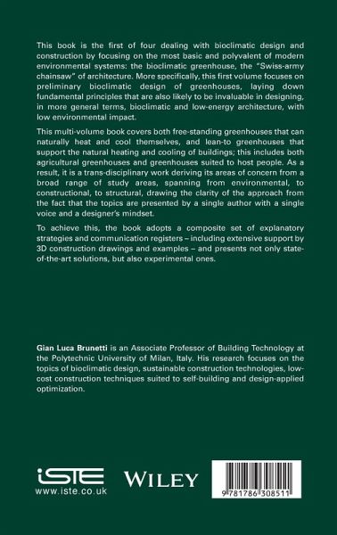 This book is the first of four dealing with bioclimatic design and construction by focusing on the most basic and polyvalent of modern environmental systems: the bioclimatic greenhouse, the "Swiss-army chainsaw" of architecture. More specifically, this first volume focuses on preliminary bioclimatic design of greenhouses, laying down fundamental principles that are also likely to be invaluable in designing, in more general terms, bioclimatic and low-energy architecture, with low environmental impact. This multi-volume book covers both free-standing greenhouses that can naturally heat and cool themselves, and lean-to greenhouses that support the natural heating and cooling of buildings; this includes both agricultural greenhouses and greenhouses suited to host people. As a result, it is a trans-disciplinary work deriving its areas of concern from a broad range of study areas, spanning from environmental, to constructional, to structural, drawing the clarity of the approach from the fact that the topics are presented by a single author with a single voice and a designer's mindset. To achieve this, the book adopts a composite set of explanatory strategies and communication registers â¿ including extensive support by 3D construction drawings and examples â¿ and presents not only stateof-the-art solutions, but also experimental ones.
