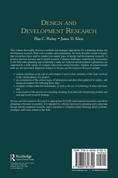 AECT Design & Development Outstanding Book Award for 2008! Design and Development Research thoroughly discusses methods and strategies appropriate for conducting design and development research. Rich with examples and explanations, the book describes actual strategies that researchers have used to conduct two major types of design and development research: 1) product and tool research and 2) model research. Common challenges confronted by researchers in the field when planning and conducting a study are explored and procedural explanations are supported by a wide variety of examples taken from current literature. Samples of actual research tools are also presented. Important features in this volume include: concise checklists at the end of each chapter to give a clear summary of the steps involved in the various phases of a project; an examination of the critical types of information and data often gathered in studies, and unique procedures for collecting these data; examples of data collection instruments, as well as the use of technology in data collection; and a discussion of the process of extracting meaning from data and interpreting product and tool and model research findings. Design and Development Research is appropriate for both experienced researchers and those preparing to become researchers. It is intended for scholars interested in planning and conducting design and development research, and is intended to stimulate future thinking about methods, strategies, and issues related to the field.
