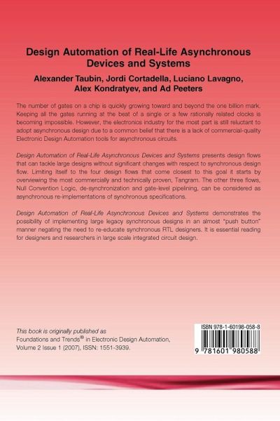 The number of gates on a chip is quickly growing toward and beyond the one billion mark. Keeping all the gates running at the beat of a single or a few rationally related clocks is becoming impossible. However, the electronics industry for the most part is still reluctant to adopt asynchronous design due to a common belief that there is a lack of commercial-quality Electronic Design Automation tools for asynchronous circuits. Design Automation of Real-Life Asynchronous Devices and Systems presents design flows that can tackle large designs without significant changes with respect to synchronous design flow. Limiting it self to the four design flows that come closest to this goal it starts by overviewing the most commercially and technically proven, Tangram. The other three flows, Null Convention Logic, de-synchronization and gate-level pipelining, can be considered as asynchronous re-implementations of synchronous specifications. Design Automation of Real-Life Asynchronous Devices and Systems demonstrates the possibility of implementing large legacy synchronous designs in an almost "push button" manner negating the need to re-educate synchronous RTL designers. It is essential reading for designers and researchers in large scale integrated circuit design.