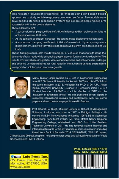 This research focuses on creating full-car models using bond graph-based approaches to study vehicle responses on uneven surfaces. Two models were developed: a standard suspension system and a more complex hinged arm suspension with active control elements.The results show that: ¿A suspension damping coefficient of ¿4 kNs/m is required for rural road vehicles to achieve speeds of ¿75 km/h. ¿As the damping coefficient increases, the sprung-mass displacement decreases. ¿A suspension damping coefficient of ¿8 kNs/m results in higher sprung-mass displacement, allowing for vehicle speeds above 50 km/h but not exceeding 75 km/h. These findings can inform the development of vehicles that can withstand the demands of rural roads while enhancing passenger comfort and vehicle durability. The results provide valuable insights for vehicle manufacturers and policymakers to design and develop vehicles tailored for rural roads in India, contributing to sustainable transportation solutions and economic growth.
