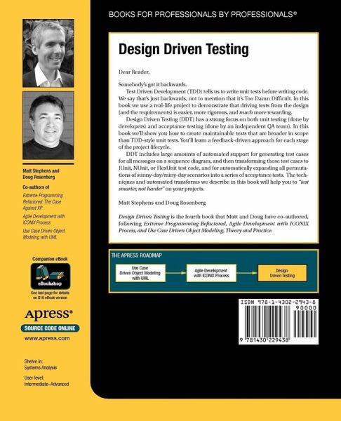 The groundbreaking book Design Driven Testing brings sanity back to the software development process by flipping around the concept of Test Driven Development (TDD)-restoring the concept of using testing to verify a design instead of pretending that unit tests are a replacement for design. Anyone who feels that TDD is "Too Damn Difficult" will appreciate this book.