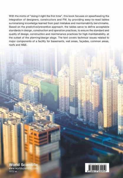With the motto of "doing it right the first time", this book focuses on spearheading the integration of designers, constructors and Facility Management, by providing easy-to-read tables summarising knowledge learned from past mistakes and maintainability benchmarks. Based on the predictive/preventive approach, the tables serve to define acceptable standards in design, construction and operation practices, to ensure the standard and quality of design, construction and maintenance practices for high maintainability at the outset of the planning/design stage. The text covers technical issues related to major components of a facility for basements, wet areas, façades, common areas, roofs and M&E.