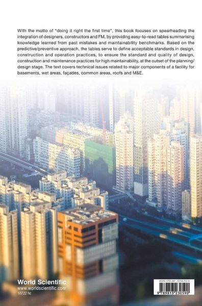 With the motto of "doing it right the first time", this book focuses on spearheading the integration of designers, constructors and Facility Management, by providing easy-to-read tables summarising knowledge learned from past mistakes and maintainability benchmarks. Based on the predictive/preventive approach, the tables serve to define acceptable standards in design, construction and operation practices, to ensure the standard and quality of design, construction and maintenance practices for high maintainability at the outset of the planning/design stage. The text covers technical issues related to major components of a facility for basements, wet areas, façades, common areas, roofs and M&E.