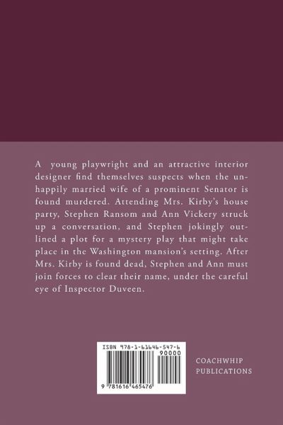 A young playwright and an attractive interior designer find themselves suspects when the unhappily married wife of a prominent Senator is found murdered. Attending Mrs. Kirby's house party, Stephen Ransom and Ann Vickery struck up a conversation, and Stephen jokingly outlined a plot for a mystery play that might take place in the Washington mansion's setting. After Mrs. Kirby is found dead, Stephen and Ann must join forces to clear their name, under the watchful eye of Inspector Duveen. Design for Murder was published in 1936.