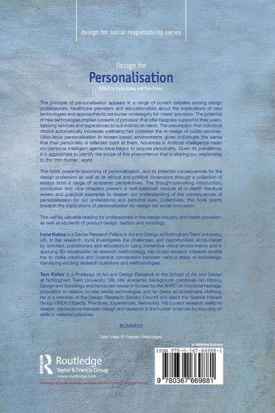 The principle of personalisation appears in a range of current debates among design professionals, healthcare providers and educationalists about the implications of new technologies and approaches to consumer sovereignty for 'mass' provision. The potential of new technologies implies systems of provision that offer bespoke support to their users, tailoring services and experiences to suit individual needs. The assumption that individual choice automatically increases wellbeing has underlain the re-design of public services. Ubiquitous personalisation in screen-based environments gives individuals the sense that their personality is reflected back at them. Advances in Artificial Intelligence mean our personal intelligent agents have begun to acquire personality. Given its prevalence, it is appropriate to identify the scope of this phenomenon that is altering our relationship to the 'non-human' world. This book presents taxonomy of personalisation, and its potential consequences for the design profession as well as its ethical and political dimensions through a collection of essays from a range of academic perspectives. The thought-provoking introduction, conclusion and nine chapters present a well-balanced mixture of in-depth literature review and practical examples to deepen our understanding of the consequences of personalisation for our professional and personal lives. Collectively, this book points towards the implications of personalisation for design-led social innovation. This will be valuable reading for professionals in the design industry and health provision, as well as students of product design, fashion and sociology.
